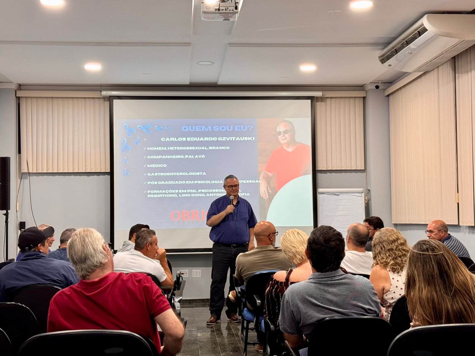 A palestra contou com as apresentações dos médicos Dr. Luís Francisco Gabriotti, urologista, e Dr. Carlos Eduardo Gzvitauski, gastroenterologista, que abordaram aspectos específicos relacionados à saúde masculina. O Dr. Luís Gabriotti detalhou as doenças relacionadas à próstata, explicando a evolução das patologias e a importância da detecção precoce.
